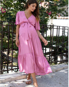 Our Cara Maternity Pink Maxi Dress with a waist tie that can be tied at the front or back this is a dress that will suit all. This elegant design is the perfect dress for your baby shower or all occasions.
