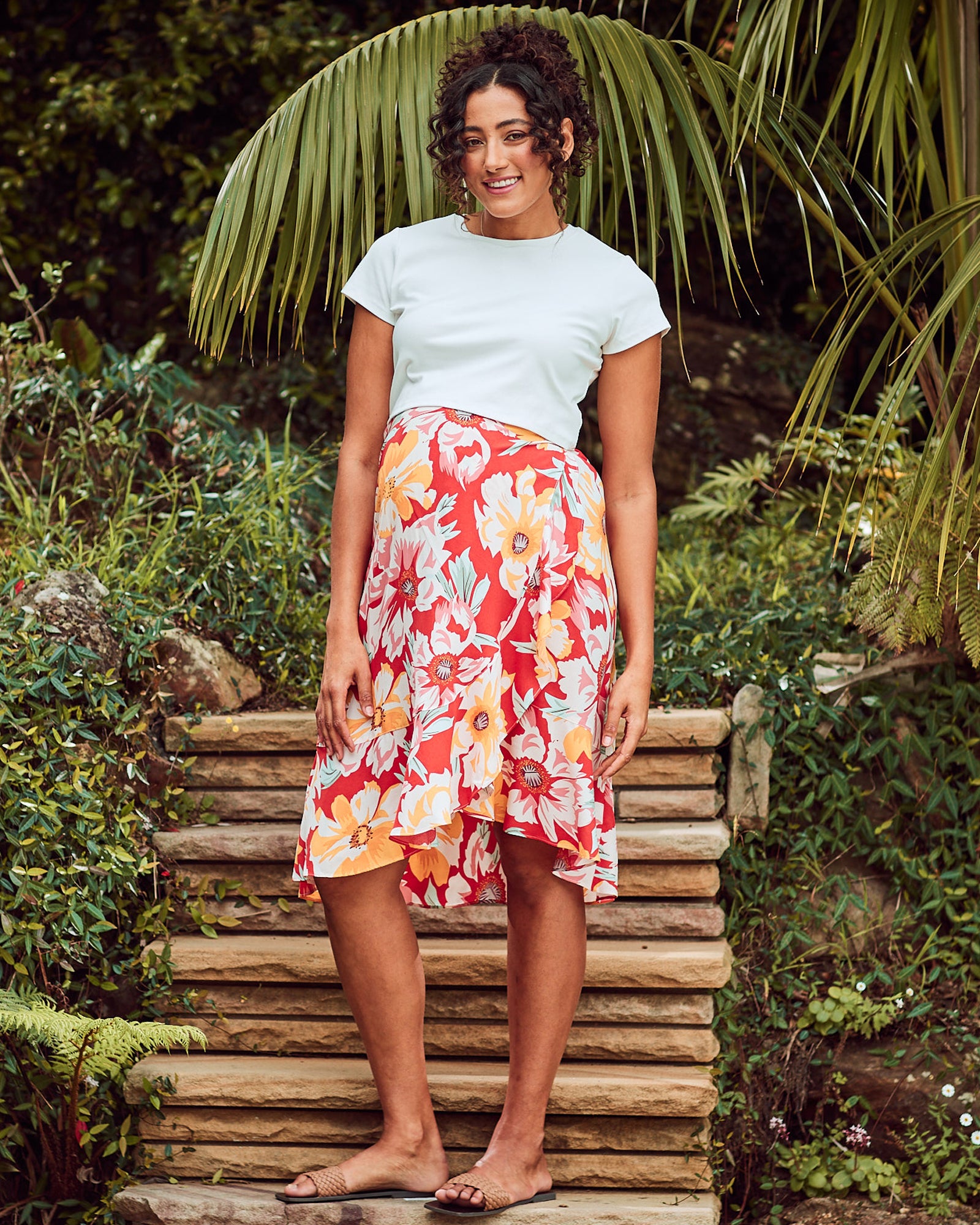 The Christie Maternity Wrap Midi Skirt in red flora is a versatile skirt that is perfect for pregnant women. The skirt is made from a soft, light fabric that is comfortable to wear all day long. The wrap design is flattering for all body types, and the midi length is perfect for any occasion.