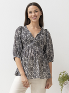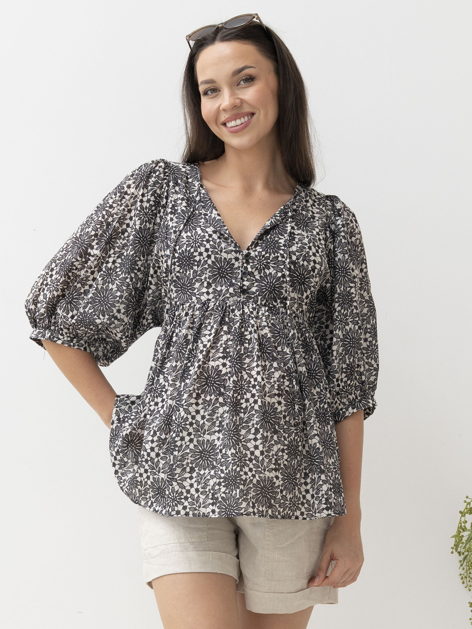 Black Daisy Print Cotton Tunic Top