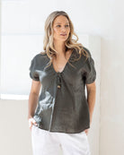 This linen maternity top is designed to drape elegantly, allowing plenty of room for growing pregnancy bump.