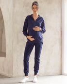 Our 2 piece maternity and nursing tracksuit set is super cosy and comfy. It comes with a super soft light blue Jumper with zippers on front. As well as matching pants in light blue that are comfy and stretchy for your growing baby bump.