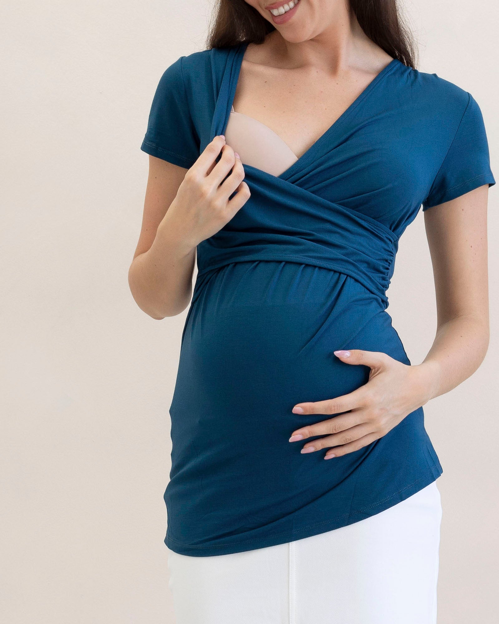 This cross over stripe fitted top is easy to wear throughout your maternity and after for nursing. Short sleeve length perfect for the hot weather days.