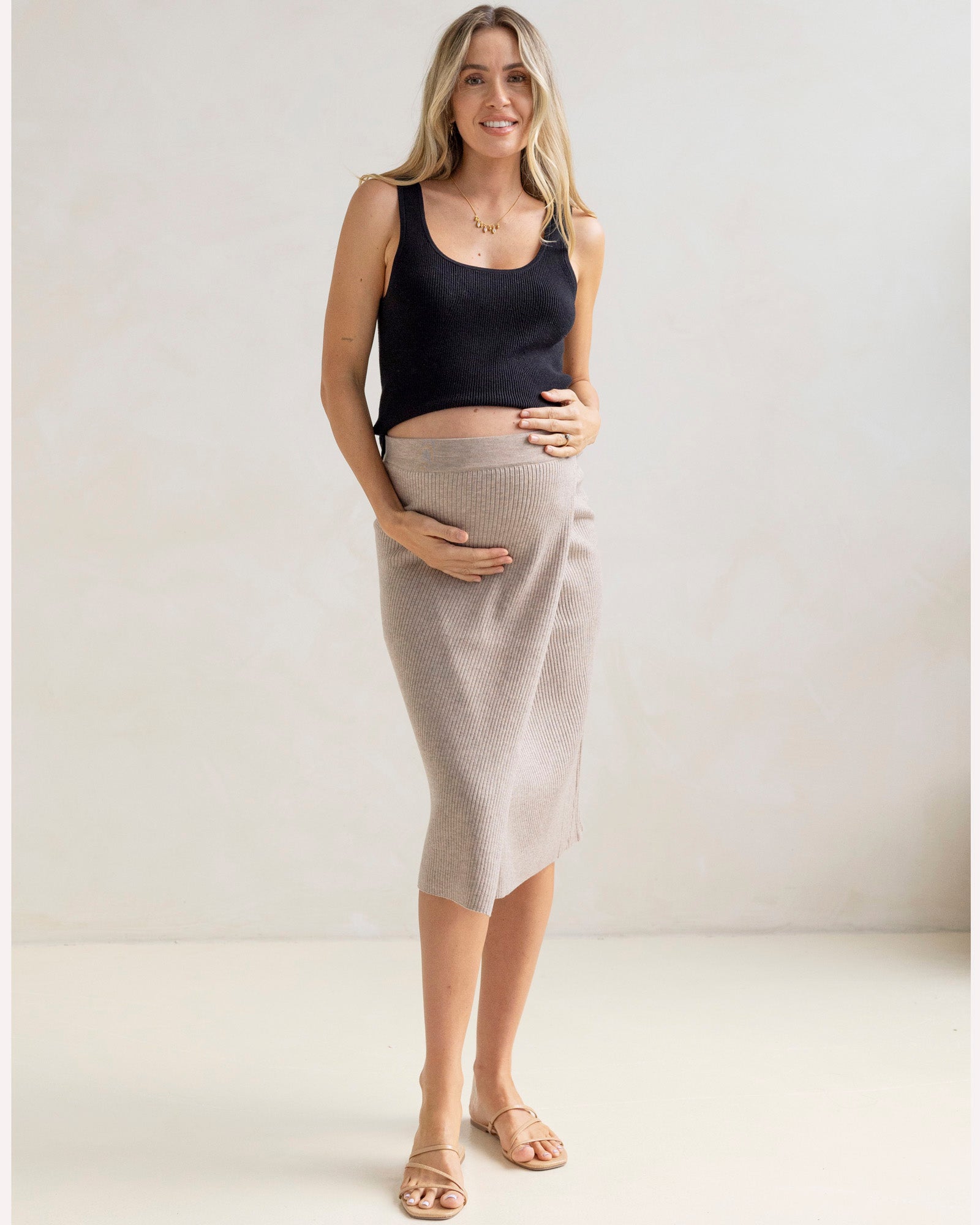 Our Cozy Elegance Wool Blend Maternity Skirt in Beige, a perfect blend of comfort and style for expectant mothers. Crafted from a high-quality wool blend knit, this skirt offers a soft and cozy feel, making it ideal for all-day wear. The side split design adds a touch of sophistication and allows for easy movement, while the neutral beige color ensures versatile pairing with any maternity top. Embrace your pregnancy journey with elegance and ease in this beautifully designed maternity skirt.