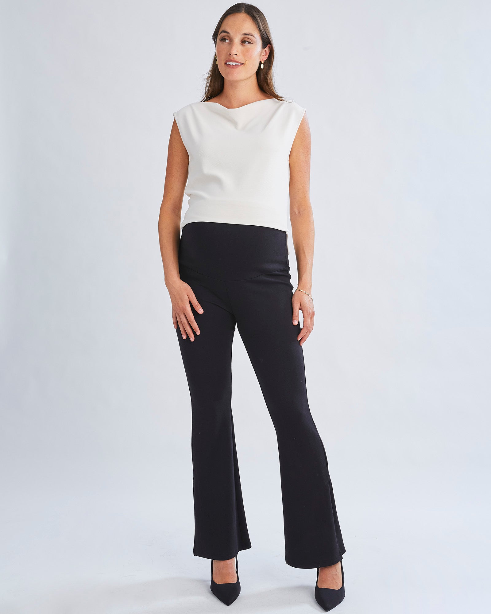 This elegant ivory white maternity top features a chic draped neckline and breathable fabric, perfect for stylish, working moms.