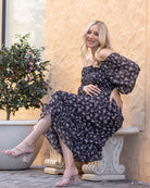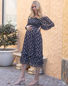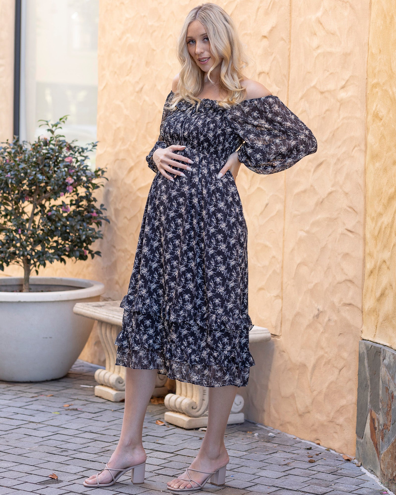 Perfect for any season, this little flower maternity dress is a flattering piece. Featuring a stretchy shirred bodice with frilled hem, loose flows skirt body. Wear it off shoulder for the big event.