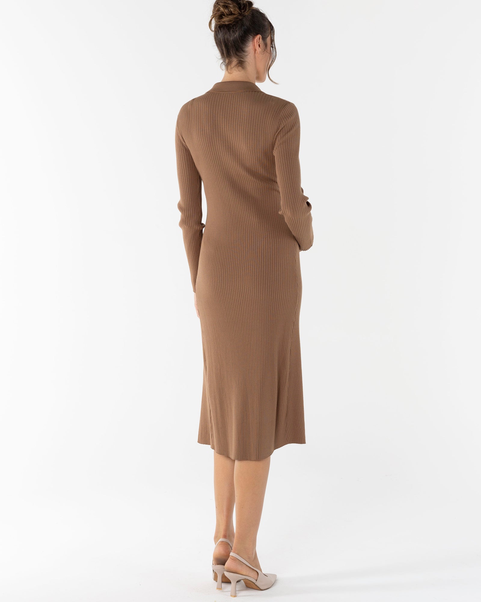 This long sleeve collared knit maternity midi dress is elegantly designed for working moms. Made from a soft blend of viscose and durable polyester, it offers both comfort and longevity. The dress features a buttoned front and a classic V-neckline, making it easy to wear while adding a touch of sophistication. Whether for workdays or casual outings, this dress provides a perfect blend of elegance and practicality.