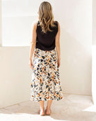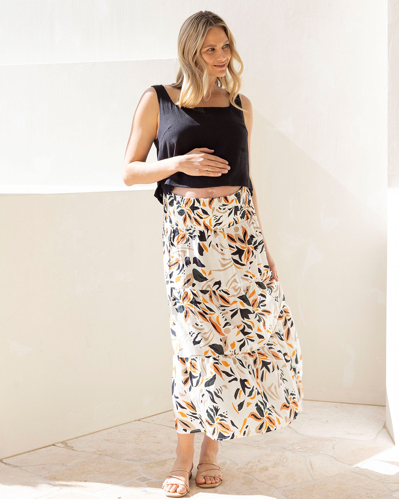 Ellie Maternity Shirred Maxi Skirt in Orange Leaf