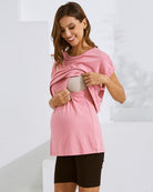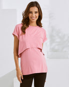 The Short Sleeve Front Panel Nursing Tee in blush pink combines style and functionality with its soft, breathable fabric and discreet front panel for easy nursing access. With a relaxed fit and a classic, versatile design, this tee is an essential piece for busy moms, whether at home or on the go. Perfectly balancing comfort and elegance, it seamlessly integrates into any maternity wardrobe.
