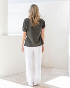 We all love these soft linen maternity pants with comfortable smock waist band, wide leg, and drawstring. Stylish, soft and comfortable, you will enjoy wearing them during your pregnancy. Pair with our basic maternity tee.