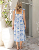 Love Lilliana Maternity Dress in new blue art print. Designed for your comfort not only when you're out in the sun, but also with the ease of access for breastfeeding time, great to team with our white knitted crop jumper for chilly days.