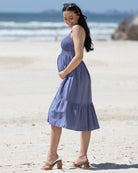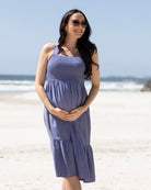 This maternity & nursing friendly smocked dress is a beautiful addition to your wardrobe. Made from a rayon blend that flows beautifully and won't cling to you during the hot weather. The shoulder straps can be tied multiple ways while being feeding friendly.