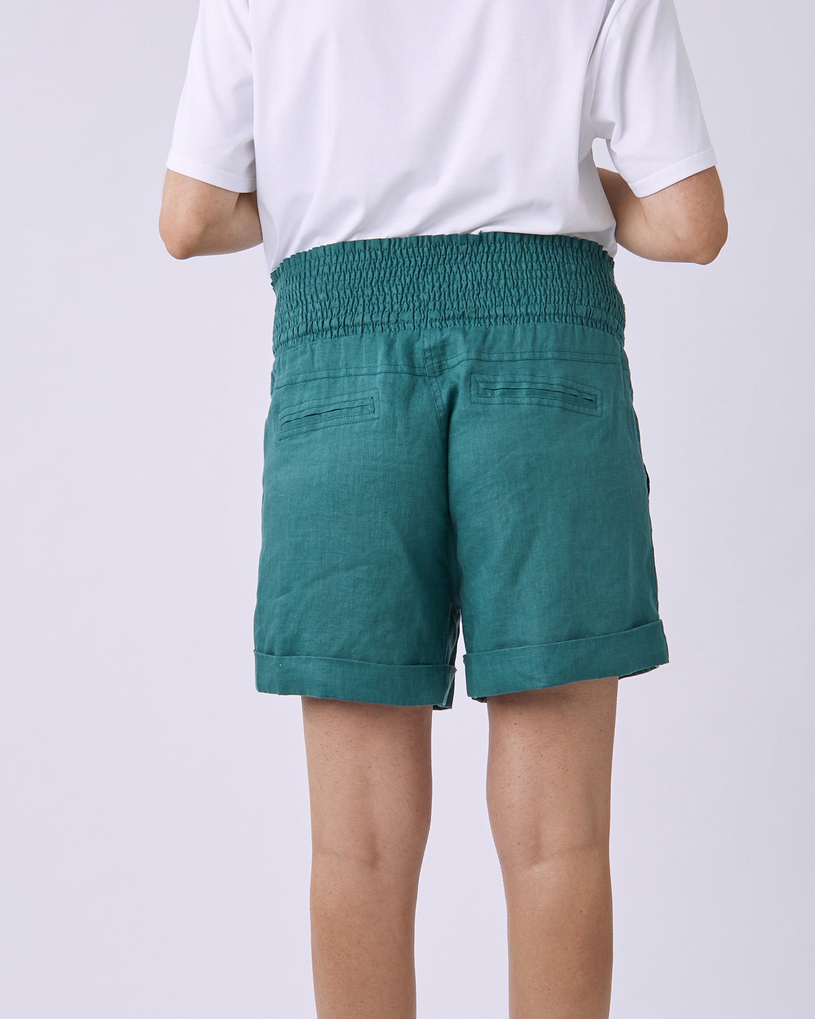 These maternity shorts are made from a lightweight natural linen fabric, as well as a thick stretchy smocked waistband that will sit comfortably over your growing belly and throughout your pregnancy.