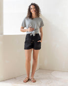 These black maternity linen shorts are made from natural linen fabric, as well as a thick stretchy smocked waistband that will sit comfortably over your growing belly and throughout your pregnancy.