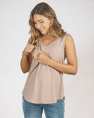 Stay cool and comfortable in this must-have taupe tank, perfect for the hot summer months. Made from a luxurious cotton-bamboo blend, this tank offers a relaxed fit and easy nursing access, making it a versatile choice for maternity and nursing.