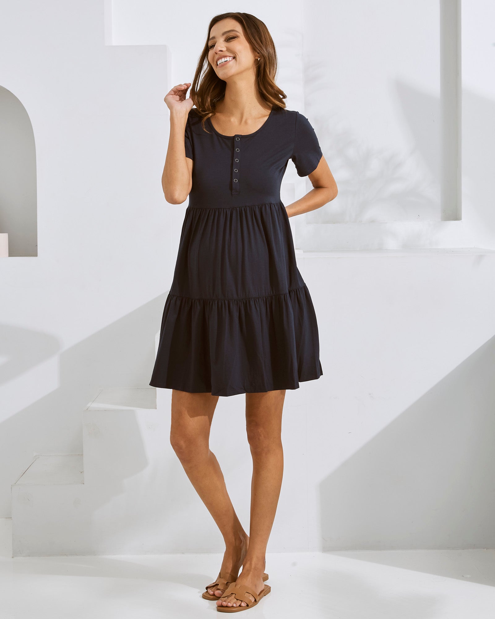 Our new maternity tiered summer dress is so cute! Made from a soft light weight material that is super comfortable and stretchy. This dress is a flowy style so it won't cling to you during the hot weather. With a button front opening for easy access when nursing.