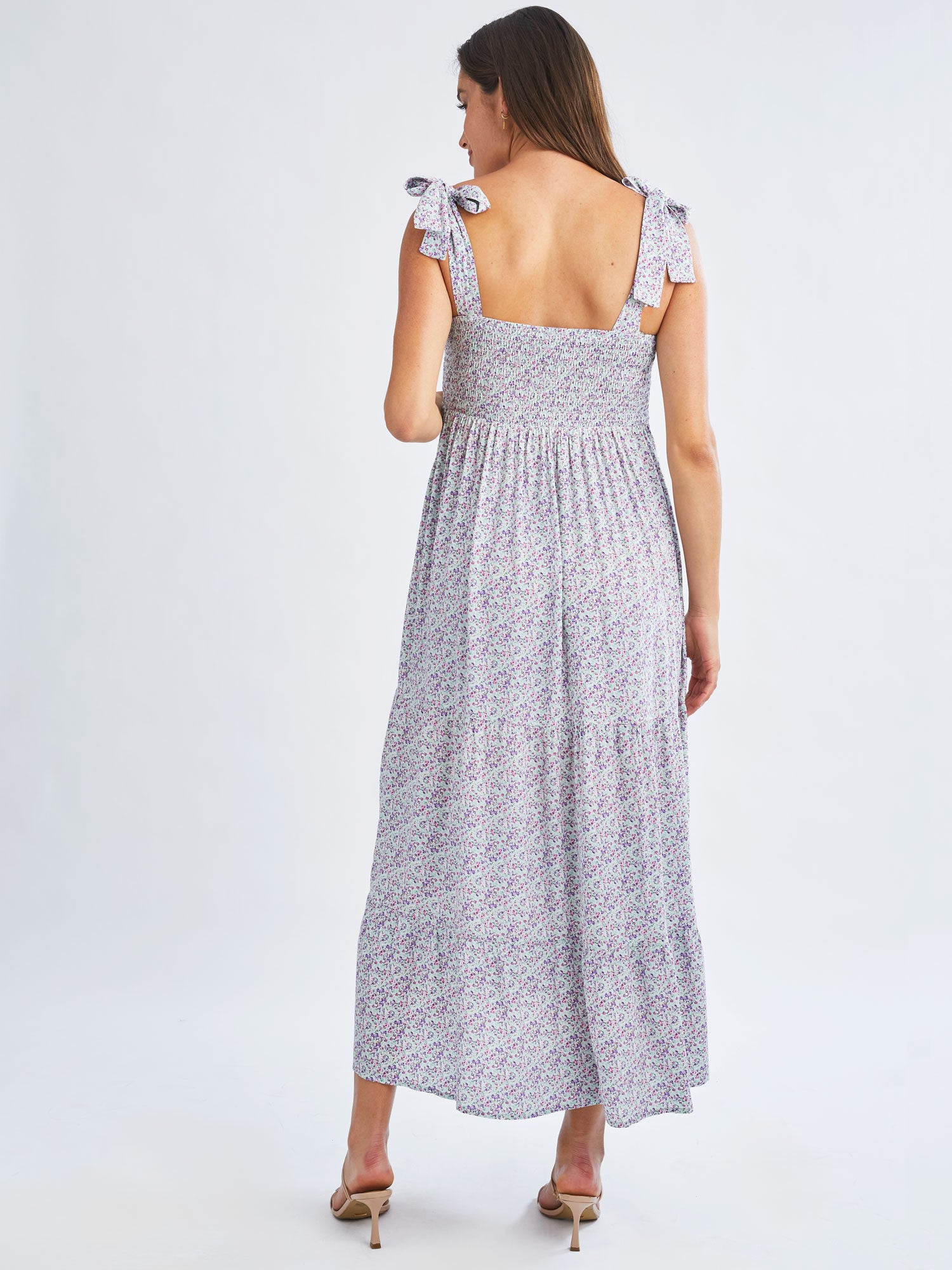 Maternity and Nursing friendly maxi lime dress with iris print. Great from early pregnancy, it is also a great nursing dress just simply undo the shoulder tie. Wear with our cropped knitted top to complete the look.