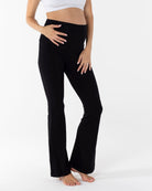 These black bootcut maternity bamboo/cotton pants are a versatile choice for your pregnancy with a bump-accommodating pull-on waistband. Designed with comfort in mind, these maternity leggings feature a versatile black flare style that accommodates your growing baby bump with a convenient pull-on waistband.