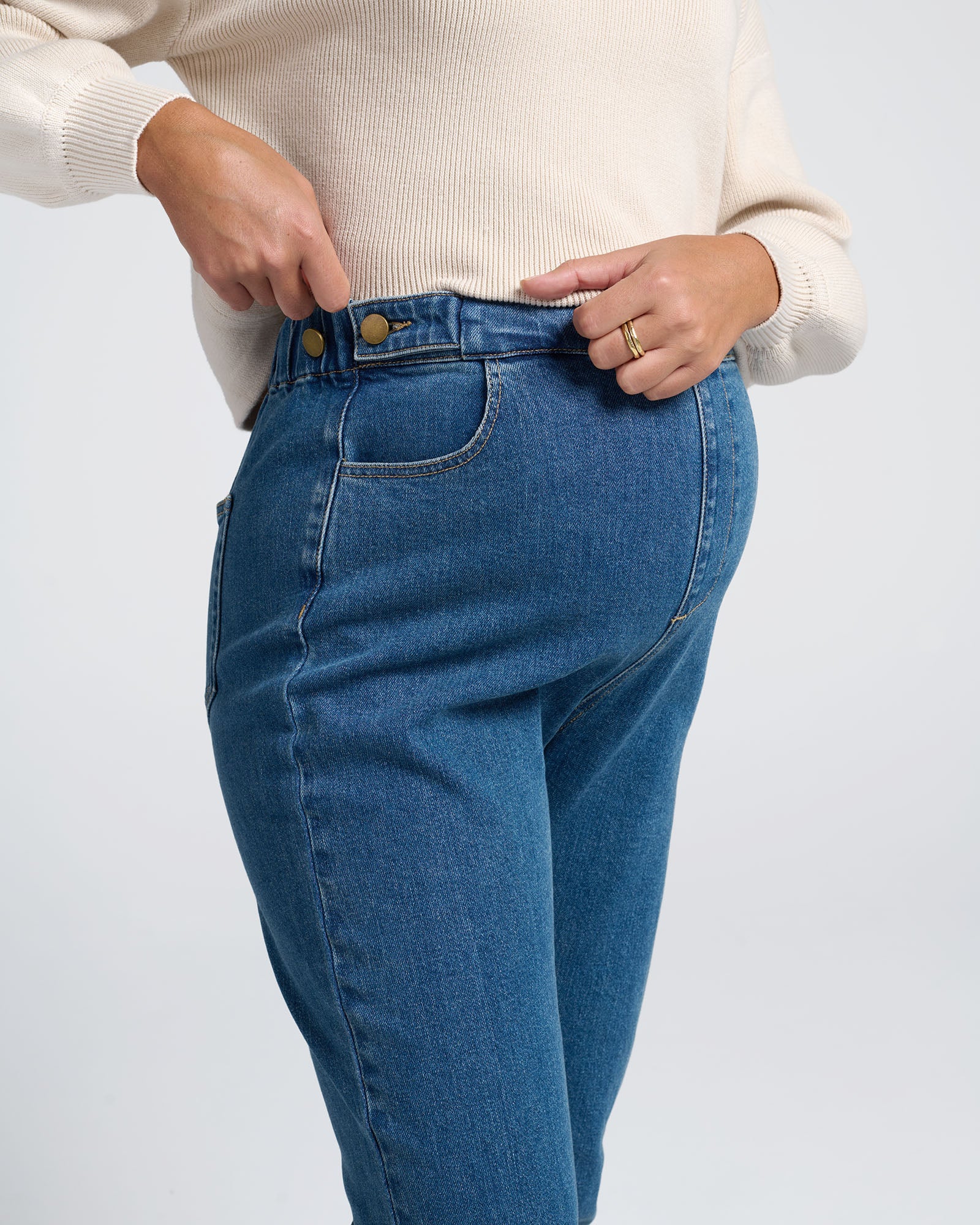 Our most comfortable high waisted maternity blue denim jeans! Cotton-rich denim with generous stretch and a neat waistband with elastic to accommodate your baby bump. Perfect to wear during pregnancy.