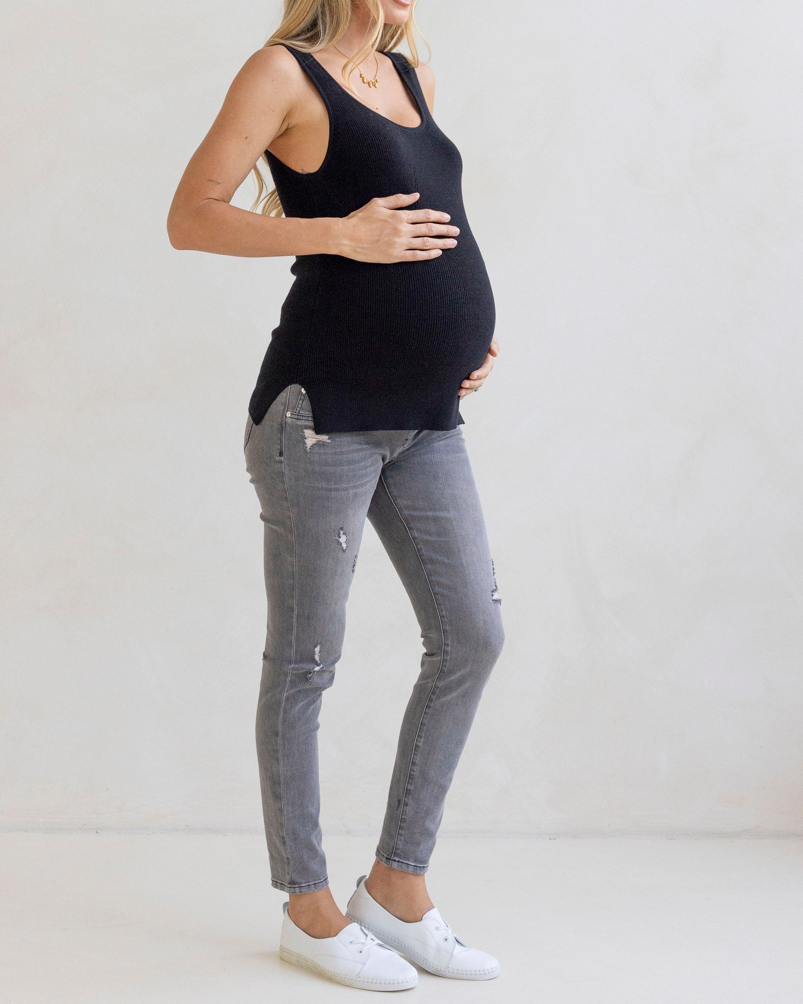 Our most comfortable maternity charcoal ripped denim jeans! Cotton-rich denim with generous stretch and wide cotton stretchy waistband to accommodate your baby bump. Perfect to wear during pregnancy.