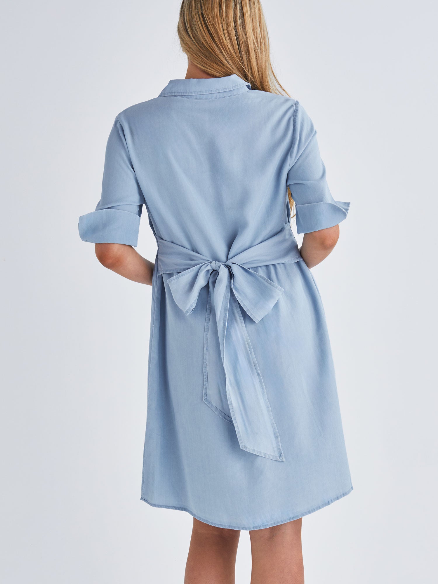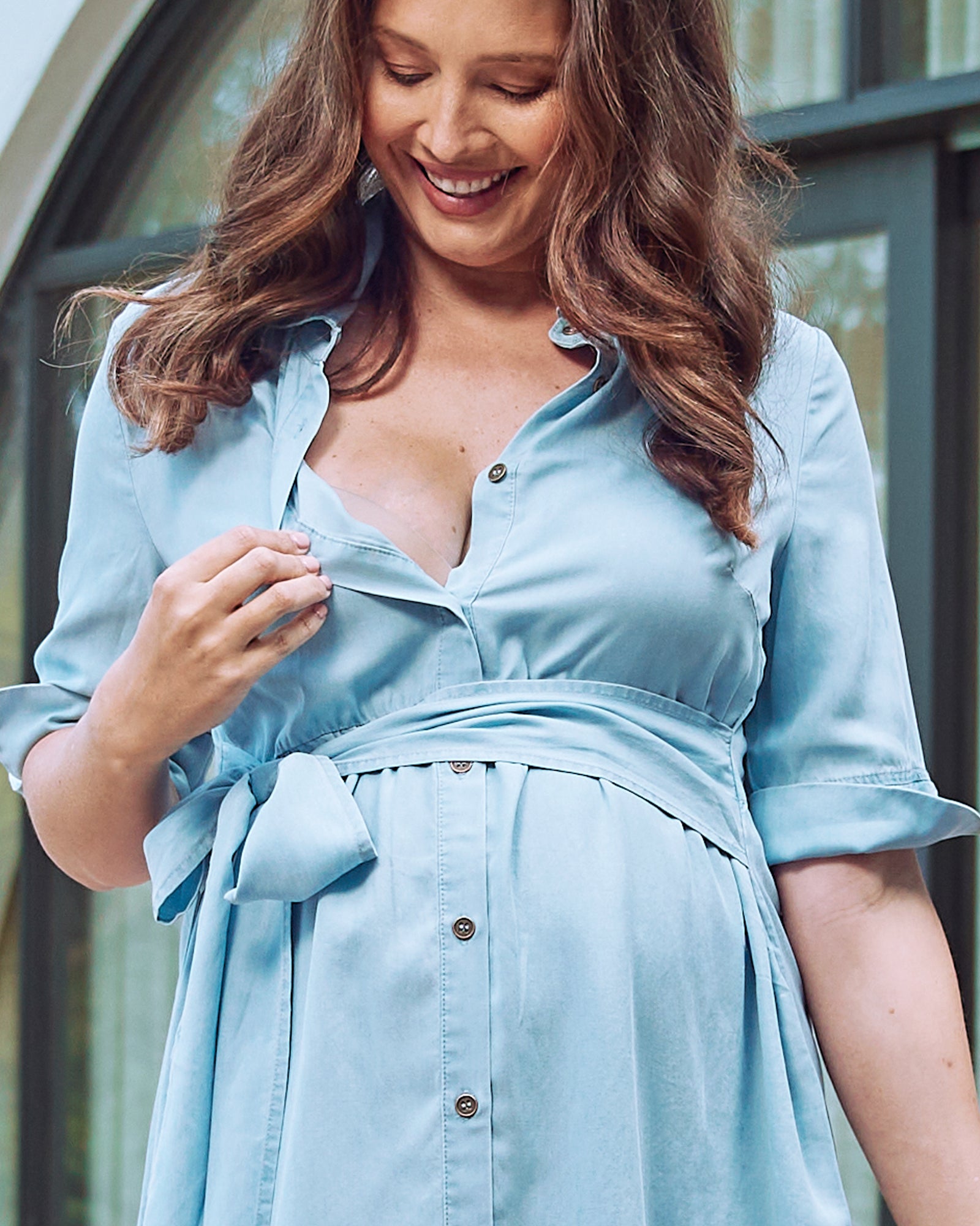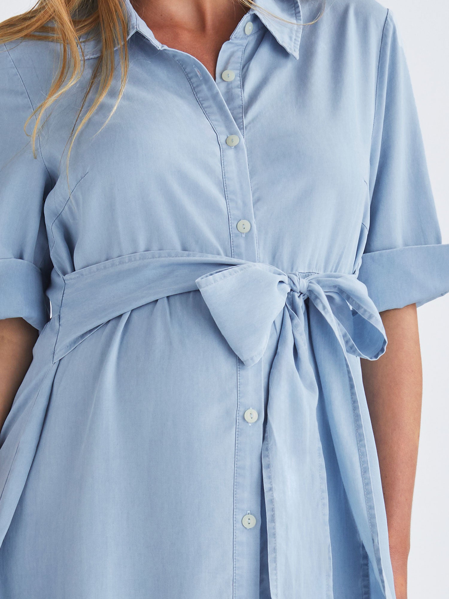 The Poppy Maternity Tencel Shirt Dress is a must-have for any expecting mother. This stylish and comfortable dress is made from soft Tencel fabric, giving you the denim look, but in a lighter, more comfortable fabric. The dress features a classic silhouette with a button-down front and a flattering waist tie. The sleeves can be rolled up or down for versatility, and the dress comes in a beautiful shade of light blue that will flatter any skin tone.