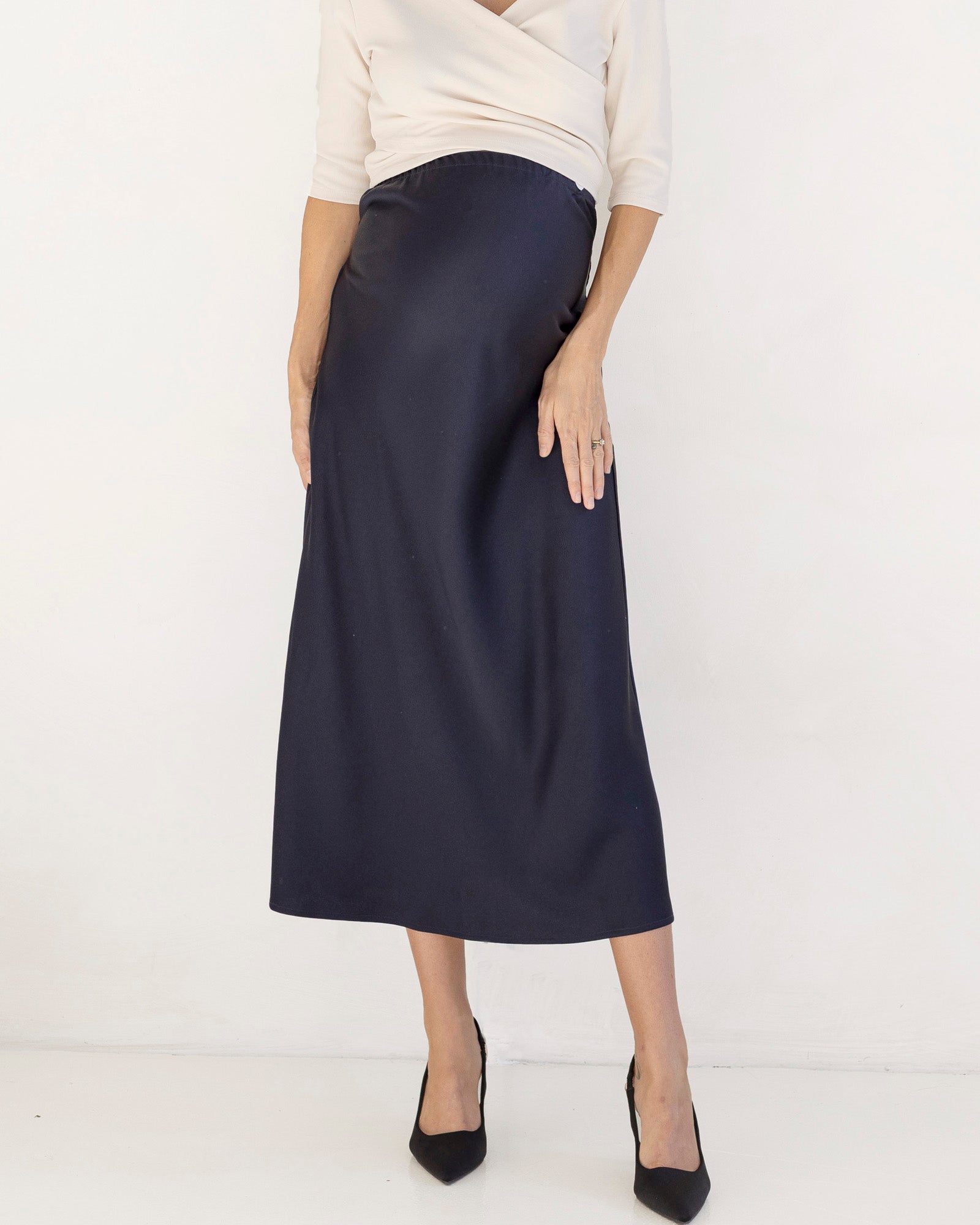 Sheena Maternity Satin-Finish Midi Work Skirt in Navy