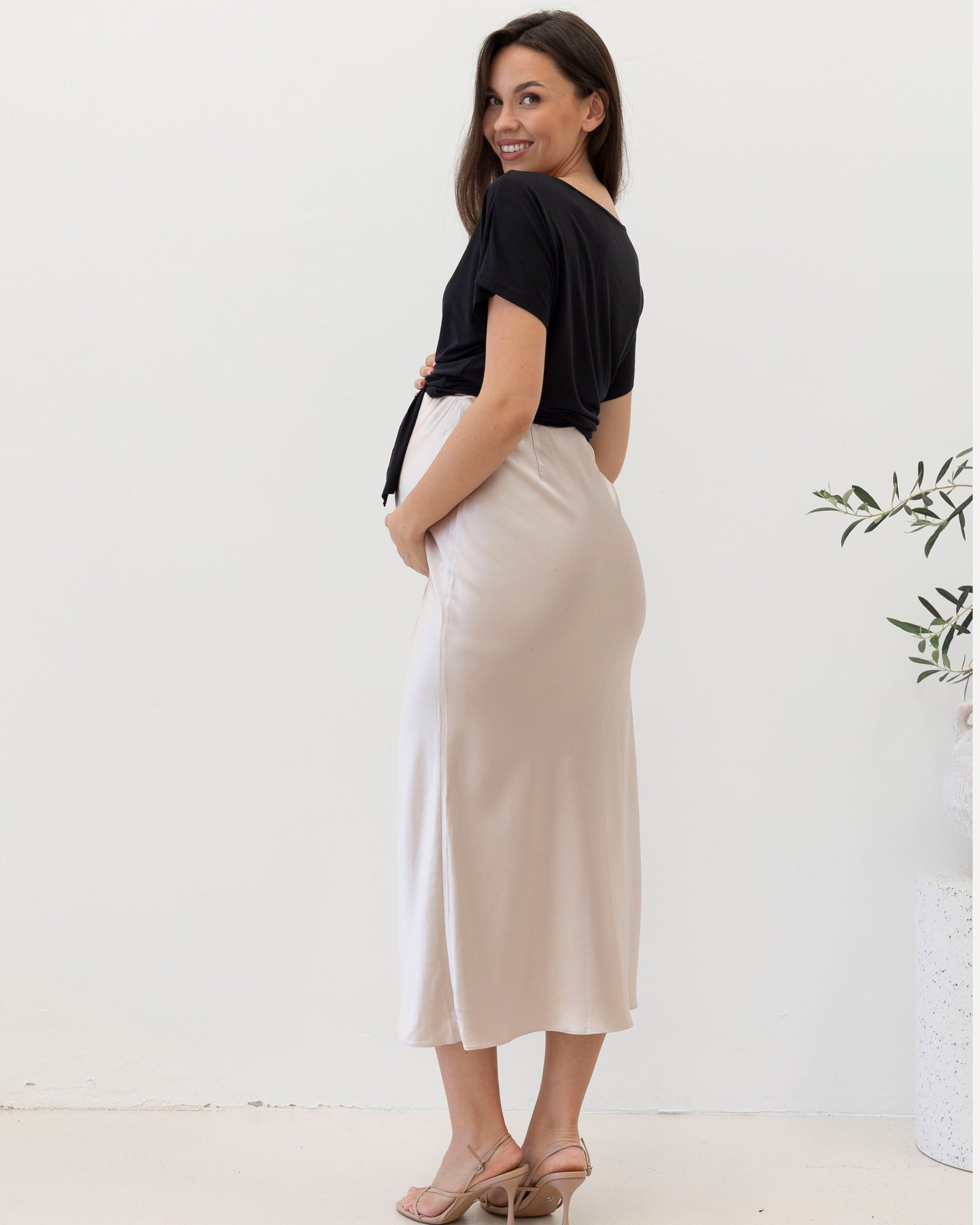 Effortless elegance meets everyday comfort in the Angel Maternity High Waist Deluxe Satin Skirt. Designed in a flattering midi length, this dressy maternity skirt is bias-cut to drape beautifully over the body, creating a soft A-line silhouette that moves with you through every stage of pregnancy.