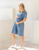 Love this day maternity denim dress, with features of smock upper part, short sleeve, knee length, light denim soft wash