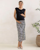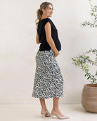 This Satin Finish midi maternity skirt in abstract black print is lux piece for any season, from work to dinner.