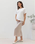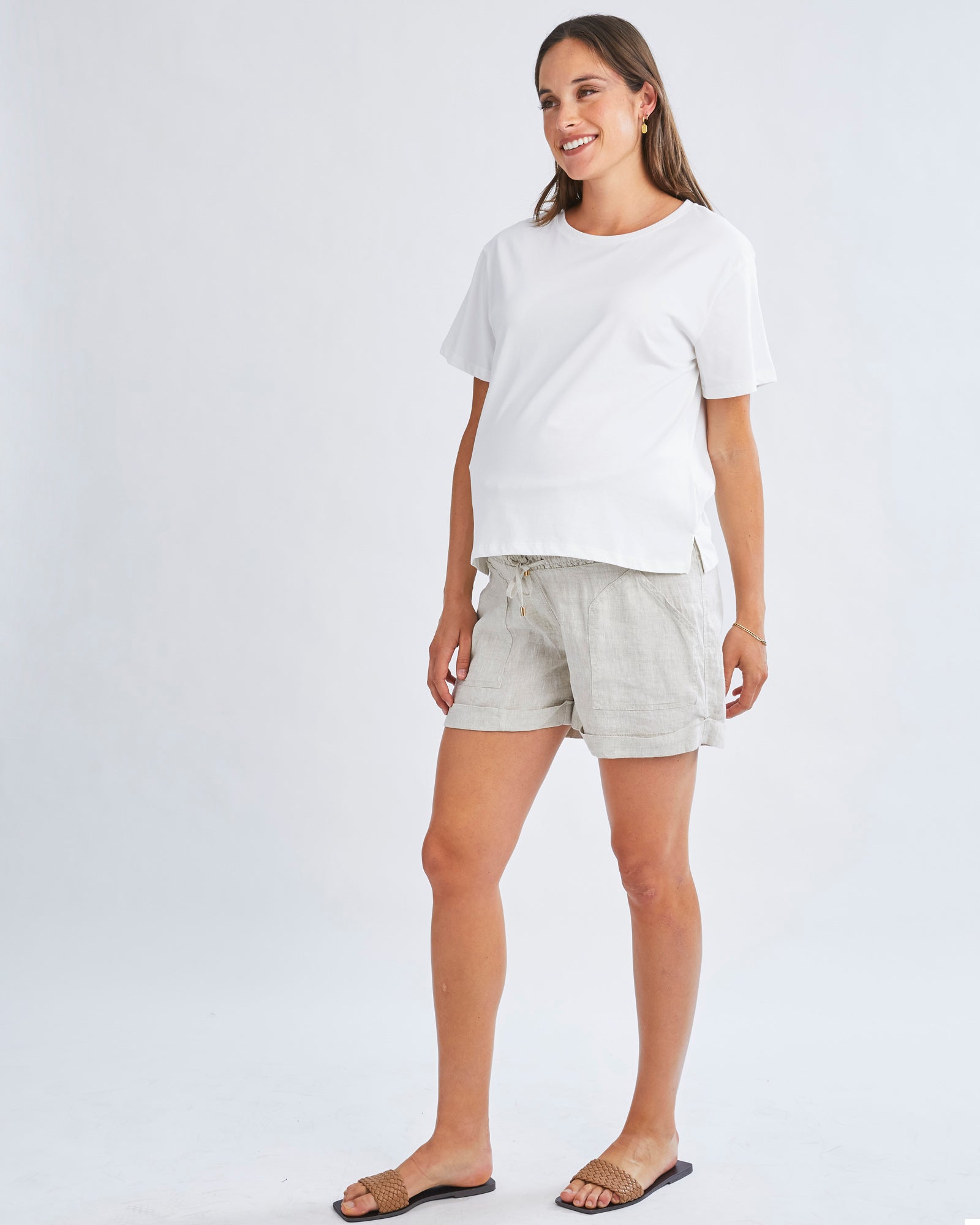 This white short-sleeve maternity cotton outfit features a simple and elegant design, crafted from high-quality pure cotton fabric that is soft and breathable. Suitable for all stages of pregnancy, the loose-fitting short-sleeve top pairs perfectly with elastic waist lounge pants, ensuring ultimate comfort and freedom for expectant mothers in any setting. The all-white design is not only stylish and versatile but also easy to mix and match with various accessories, making it an ideal choice for everyday maternity wear.